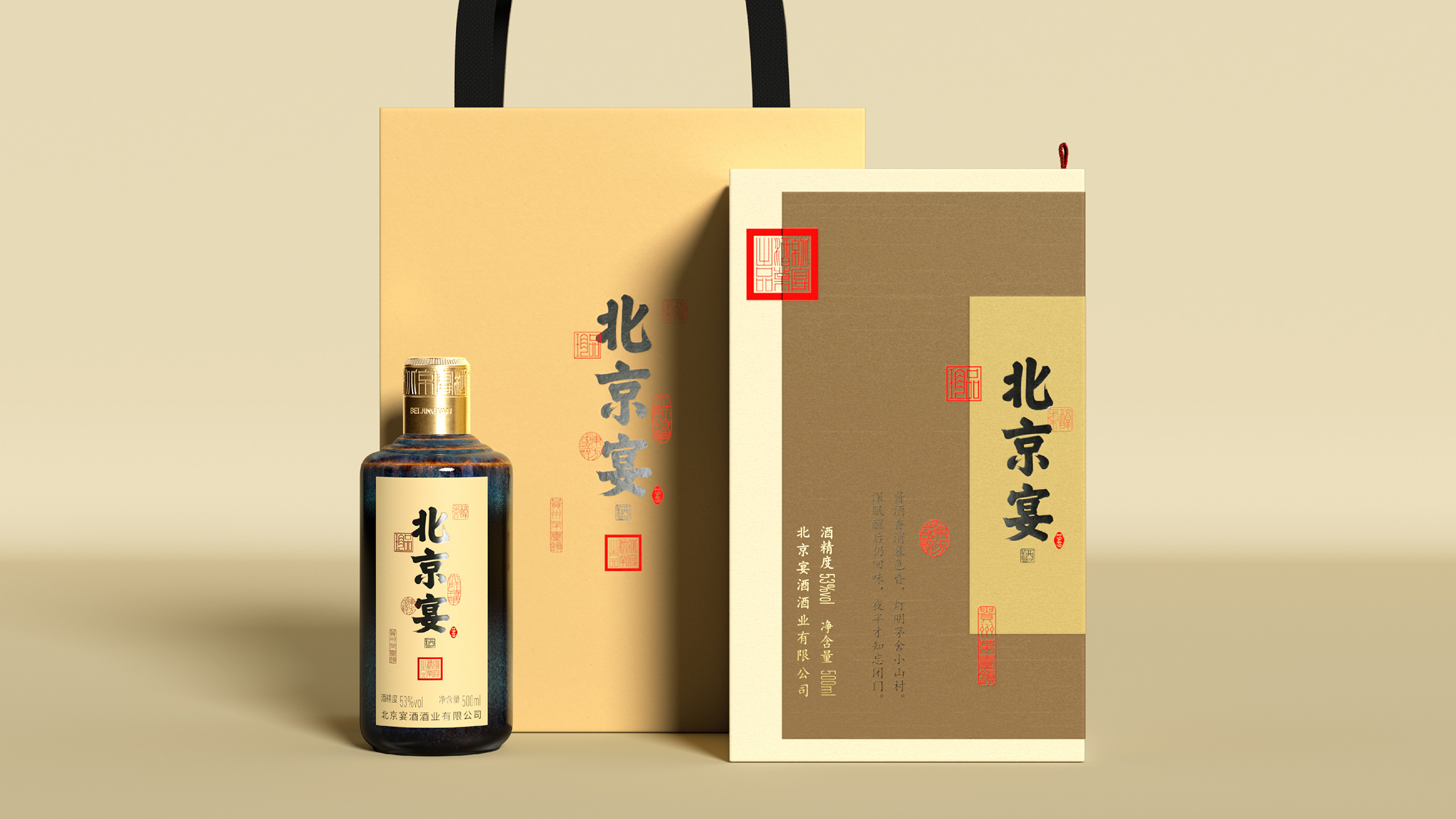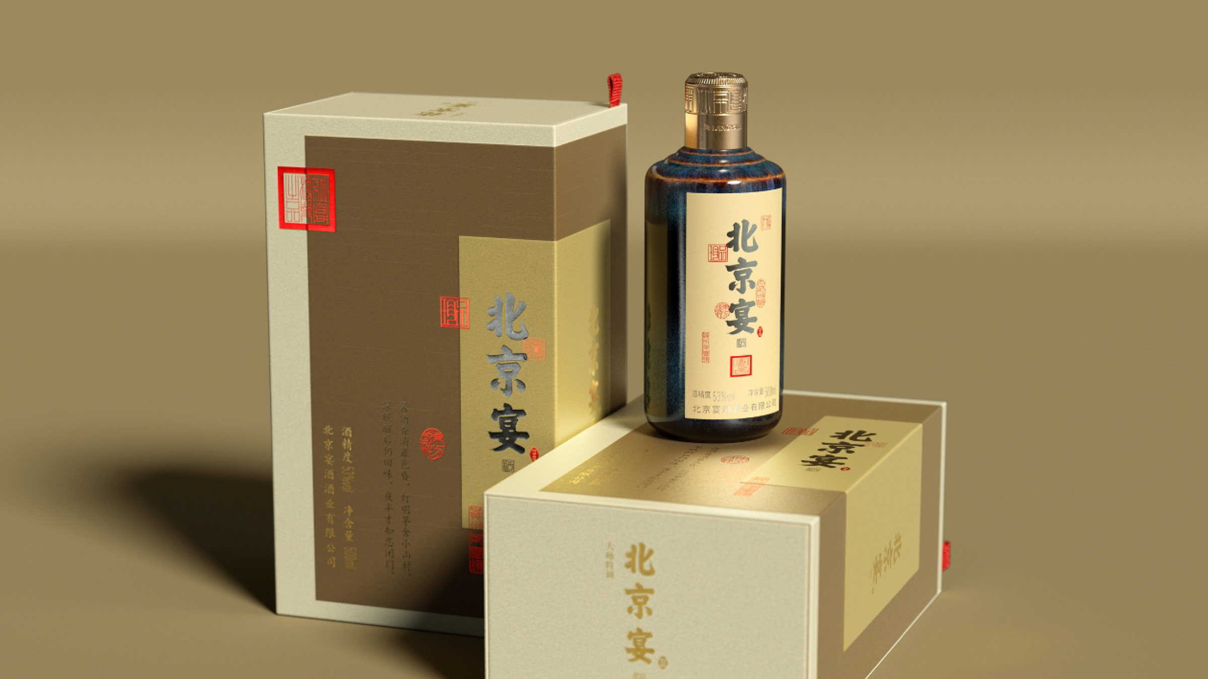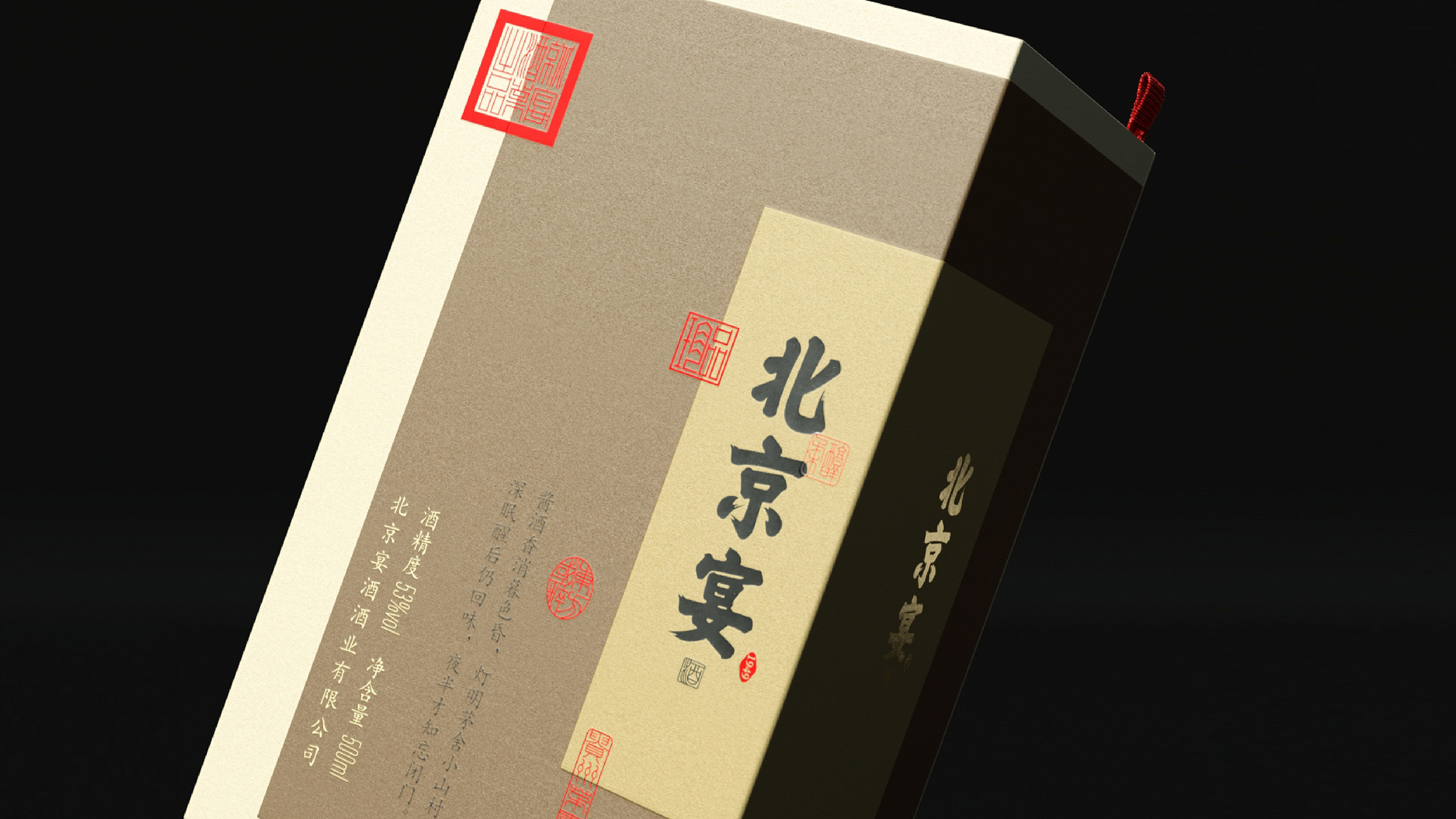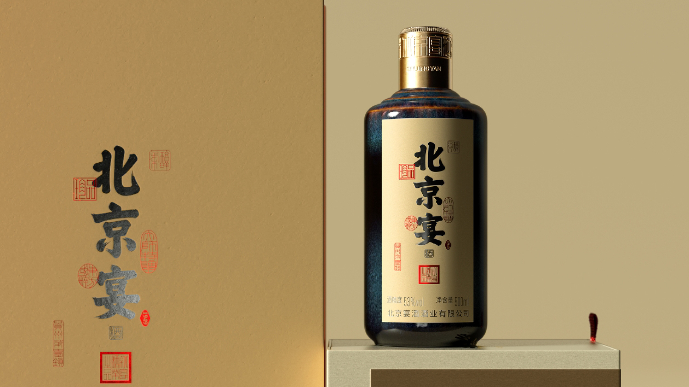 北京宴酒出自中国供销系统,是具有三十多年历史的北京地区白酒品牌,设计师承担了北京宴酒从地方特色酒向中国酱酒转型升级的任务。设计师通过对北京宴历史以及未来发展目标的理解,强化“北京”文化元素的表达,通过皇城、故宫元素的视觉物化,在瓶型创作、瓶盖创意以及瓶身、外盒的视觉元素上,形成“北京”元素的矩阵式表现。同时给出“来北京,就喝北京宴”的传播定位和Slogan口号。Beijing Banquet Liquor is a Baijiu brand in Beijing with a history of more than 30 years. The designer undertook the task of transforming and upgrading Beijing Banquet Liquor from local characteristic liquor to Chinese sauce liquor. By understanding the history and future development goals of Beijing banquets, designers strengthen the expression of "Beijing" cultural elements. Through the visual materialization of imperial city and Forbidden City elements, a matrix representation of "Beijing" elements is formed in bottle shape creation, bottle cap creativity, and visual elements of bottle body and outer box. At the same time, provide the dissemination positioning and slogan of "Come to Beijing, drink Beijing banquet".