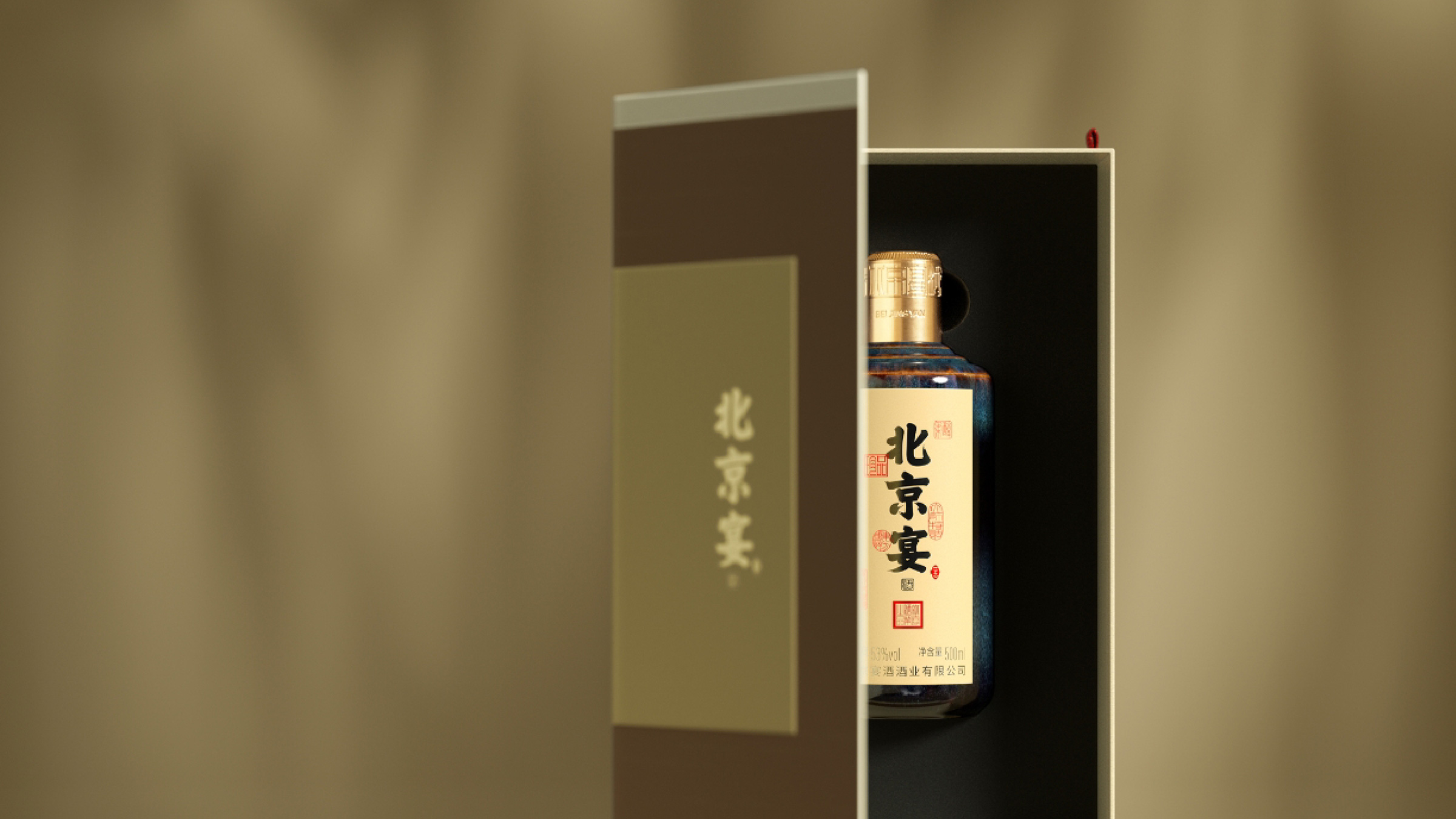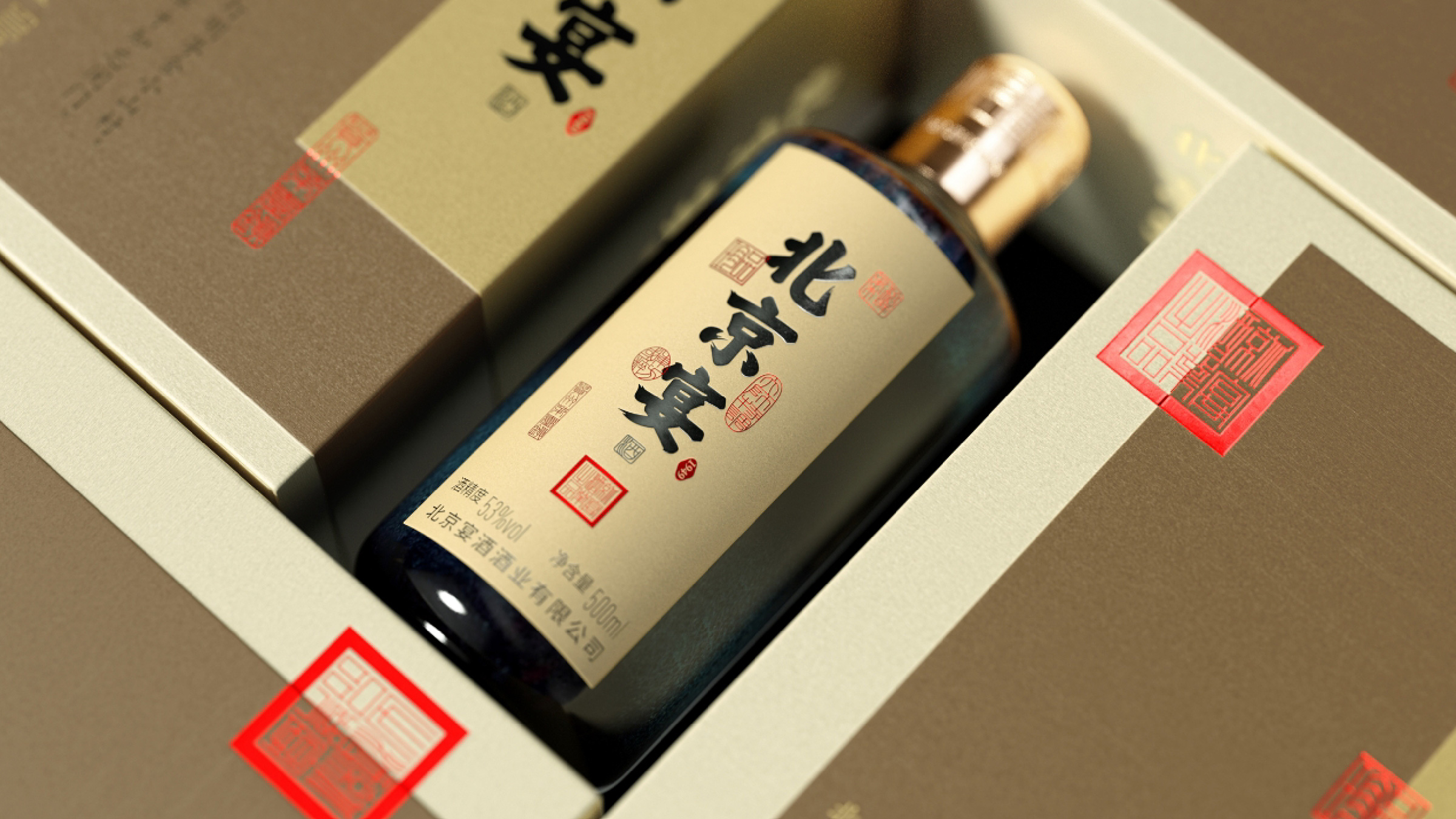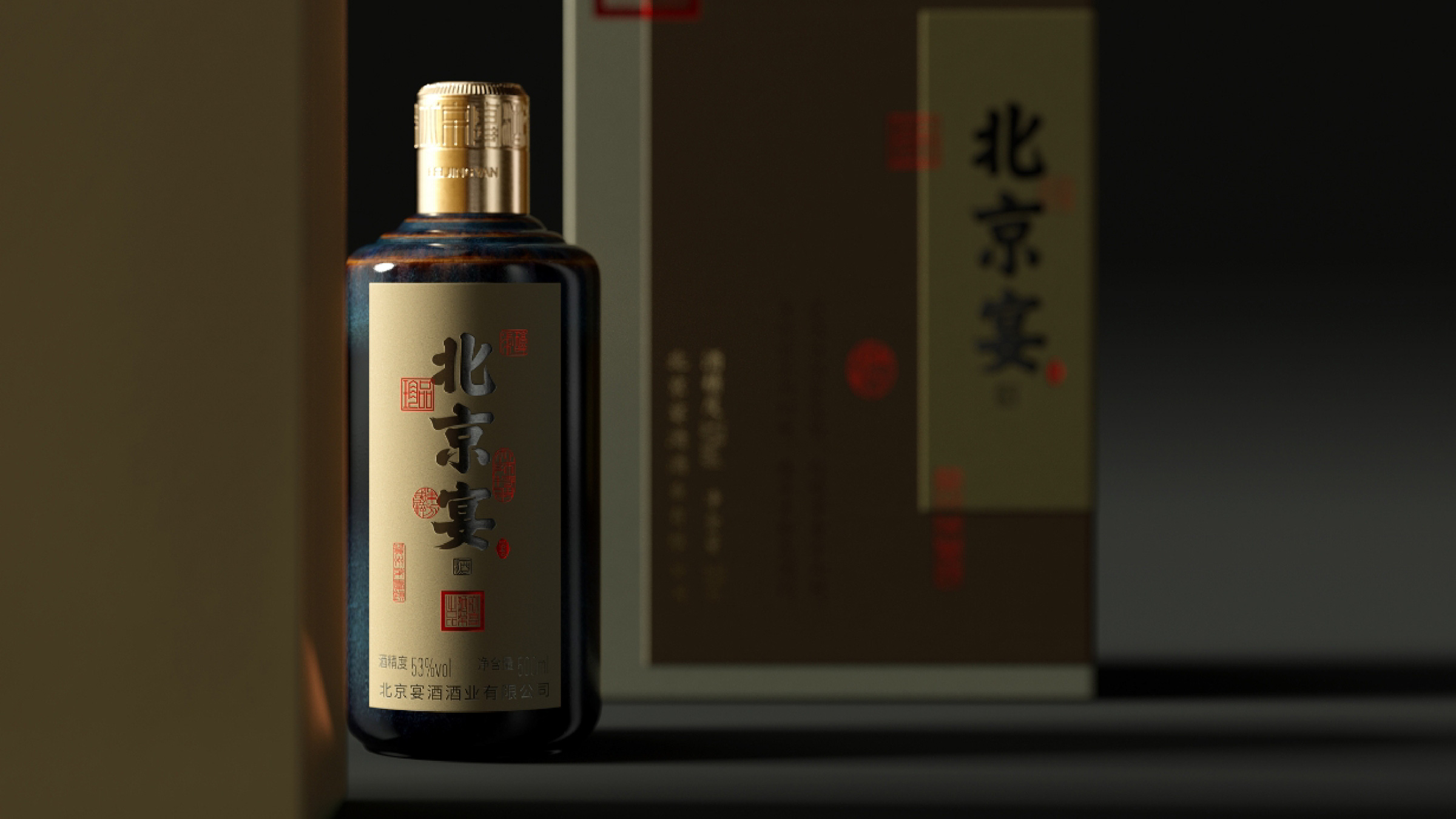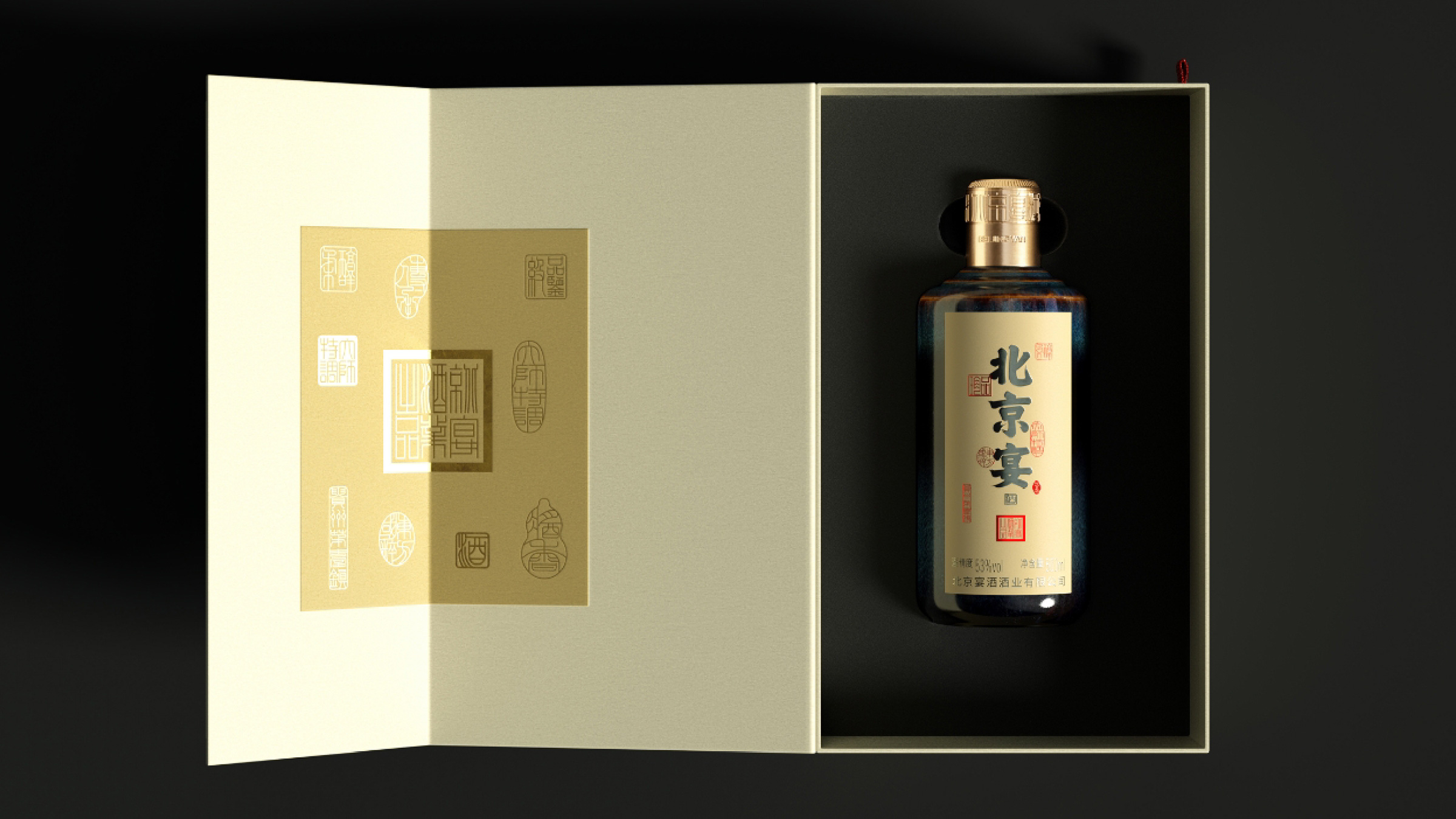 北京宴酒出自中国供销系统,是具有三十多年历史的北京地区白酒品牌,设计师承担了北京宴酒从地方特色酒向中国酱酒转型升级的任务。设计师通过对北京宴历史以及未来发展目标的理解,强化“北京”文化元素的表达,通过皇城、故宫元素的视觉物化,在瓶型创作、瓶盖创意以及瓶身、外盒的视觉元素上,形成“北京”元素的矩阵式表现。同时给出“来北京,就喝北京宴”的传播定位和Slogan口号。Beijing Banquet Liquor is a Baijiu brand in Beijing with a history of more than 30 years. The designer undertook the task of transforming and upgrading Beijing Banquet Liquor from local characteristic liquor to Chinese sauce liquor. By understanding the history and future development goals of Beijing banquets, designers strengthen the expression of "Beijing" cultural elements. Through the visual materialization of imperial city and Forbidden City elements, a matrix representation of "Beijing" elements is formed in bottle shape creation, bottle cap creativity, and visual elements of bottle body and outer box. At the same time, provide the dissemination positioning and slogan of "Come to Beijing, drink Beijing banquet".
